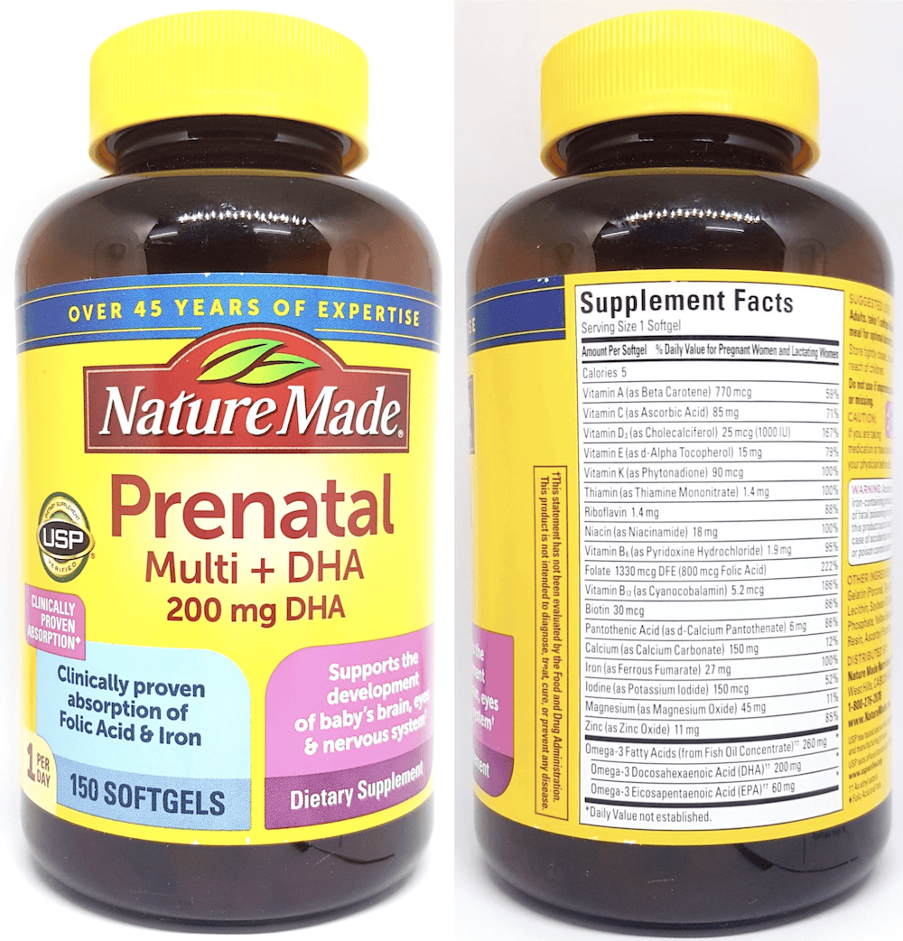 - Prenatal ( Nature Made Prenatal Multi + DHA ) được sản xuất bởi hãng Nature Made của Hoa Kỳ nhằm cung cấp những vitamin, khoáng chất thiết yếu như DHA, acid folic, sắt, vitamin D… giúp tăng cường sức khỏe, giảm nguy cơ mắc bệnh tật cho mẹ và bé yêu. Đây là loại thuốc bổ bà bầu được khá nhiều mẹ tin dùng bởi thành phần dinh dưỡng khá cân bằng và đầy đủ.